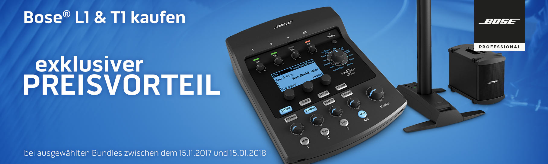 Bose L1 - die Nr. 1 unter den Säulenlautsprecher-Systemen bieten wir ab sofort in attraktiven Bundles inklusive Bose T1 Tone Match Digitalmixer an. Das perfekte Live-Tool für Musiker kaufen Sie bei MUSIC STORE professional mit einem exklusiven Preisvorteil - nur solange der Vorrat reicht!